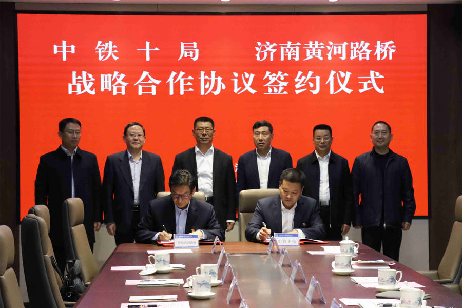 ? 11月22日,濟(jì)南黃河路橋建設(shè)集團(tuán)與中鐵十局集團(tuán)戰(zhàn)略合作簽約儀式在中鐵十局集團(tuán)總部舉行。中鐵十局集團(tuán)總經(jīng)理李海峰,副總經(jīng)理?xiàng)钣袢?、周建明;?jì)南軌道交通集團(tuán)黨委書記、董事長陳思斌,黨委委員、副總經(jīng)理、總會(huì)計(jì)師丁強(qiáng),副總經(jīng)理劉鳳洲,集團(tuán)公司黨委副書記、總經(jīng)理謝技勛等參加活動(dòng)。