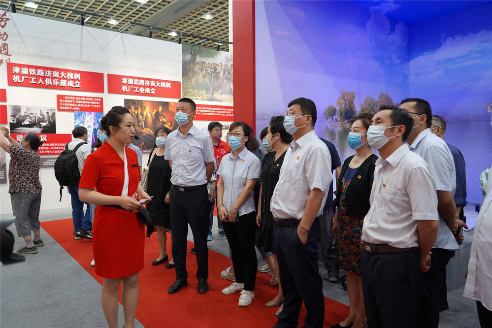 ? 展覽中有許多文物和場景再現(xiàn),最早的《共產黨宣言》中譯本、中共一大代表群像雕塑、濟南共產黨早期組織活動照片、濟南戰(zhàn)役攻城復原場景、抗美援朝戰(zhàn)爭現(xiàn)場照片、20世紀六七十年代濟南工廠廠牌、改革開放時期濟南市民真實生活場景、社會主義現(xiàn)代化下的經濟發(fā)展成果照片等等,通過講解員的講解和實物再現(xiàn),讓在場的黨員感受黨的百年征程和輝煌成就。